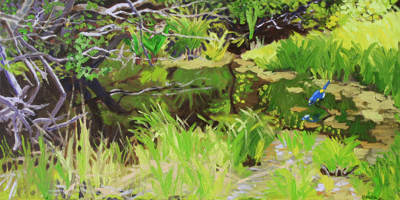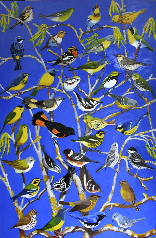 “Yellow-Rumped Warblers Foraging in an Alder Swamp” oil on canvas 12″ x…