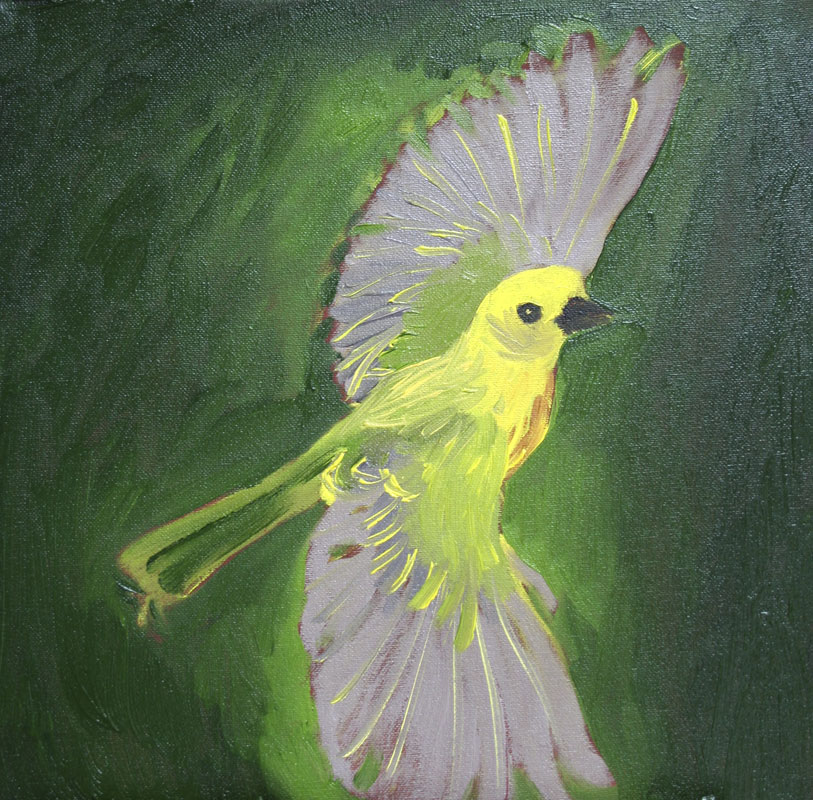 “Yellow Warbler in Flight” oil 12″ x 12″