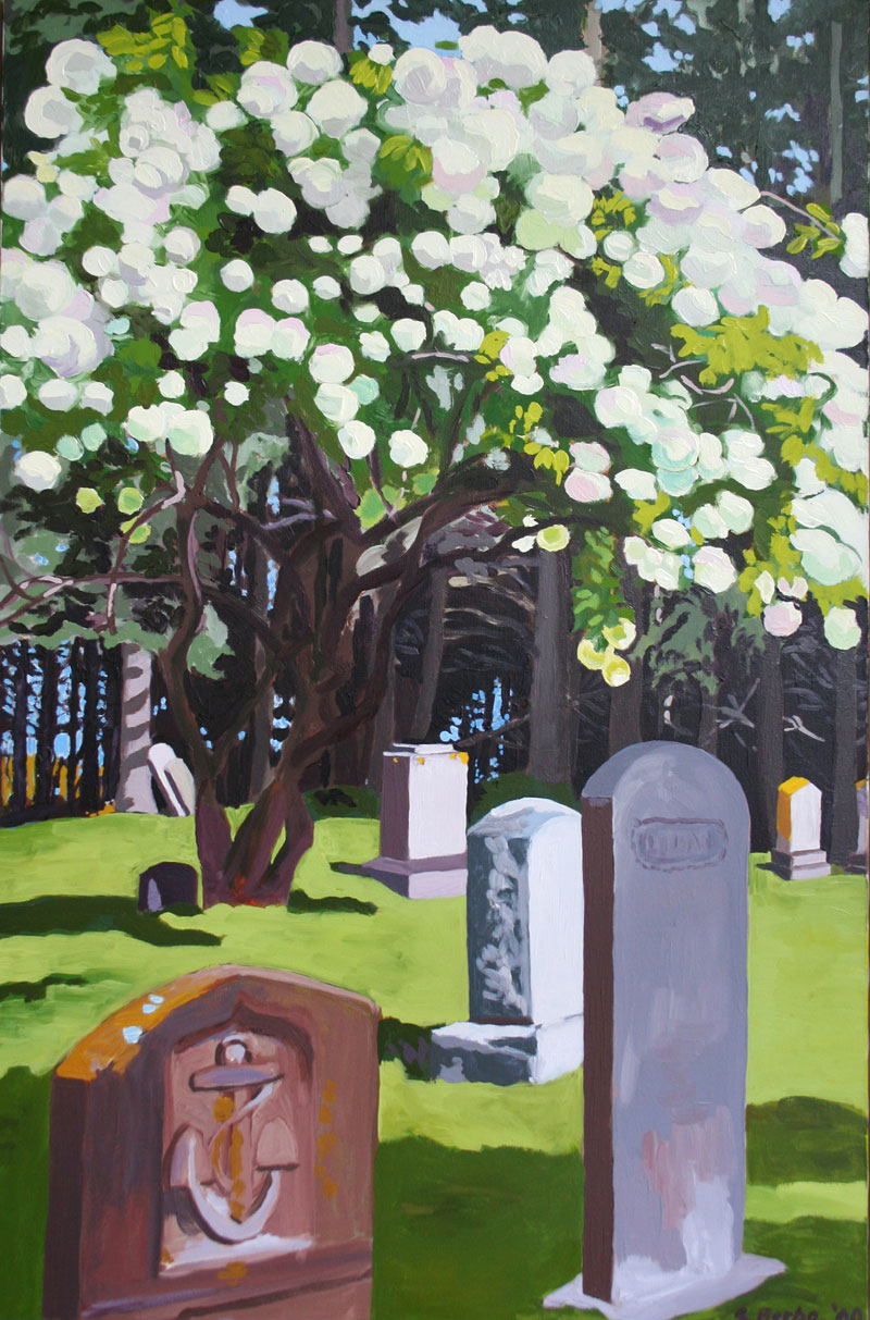 “Island Cemetery with Hydrangea” oil on canvas by Susan Beebe