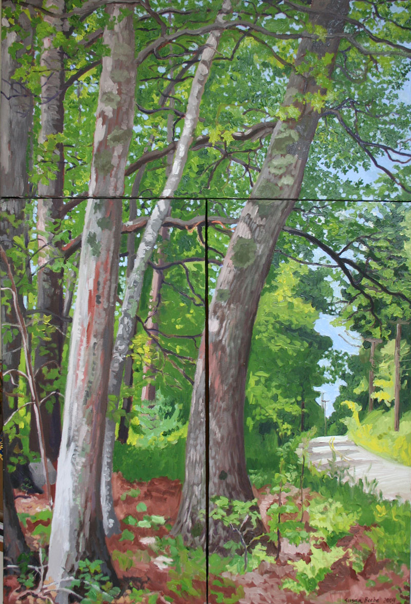 “Red Oaks, Route One, Camden” oil on canvas by Susan Beebe