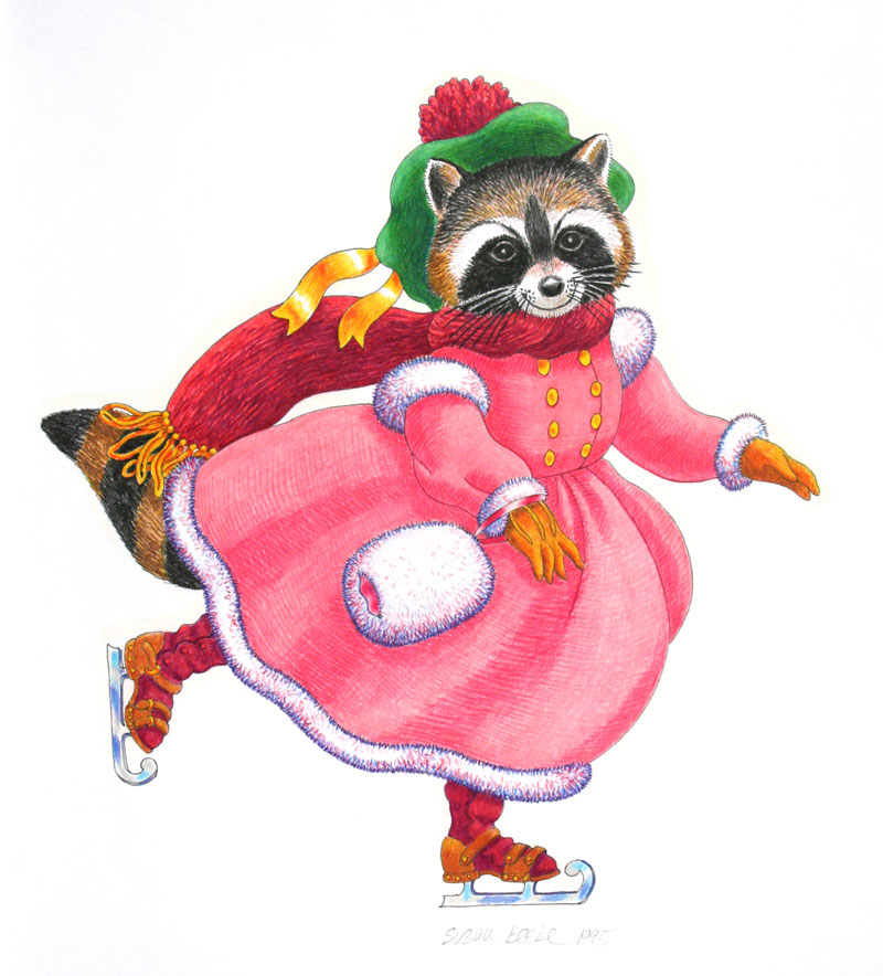 “Ice Skating Raccoon” colored pencil on paper by Susan Beebe