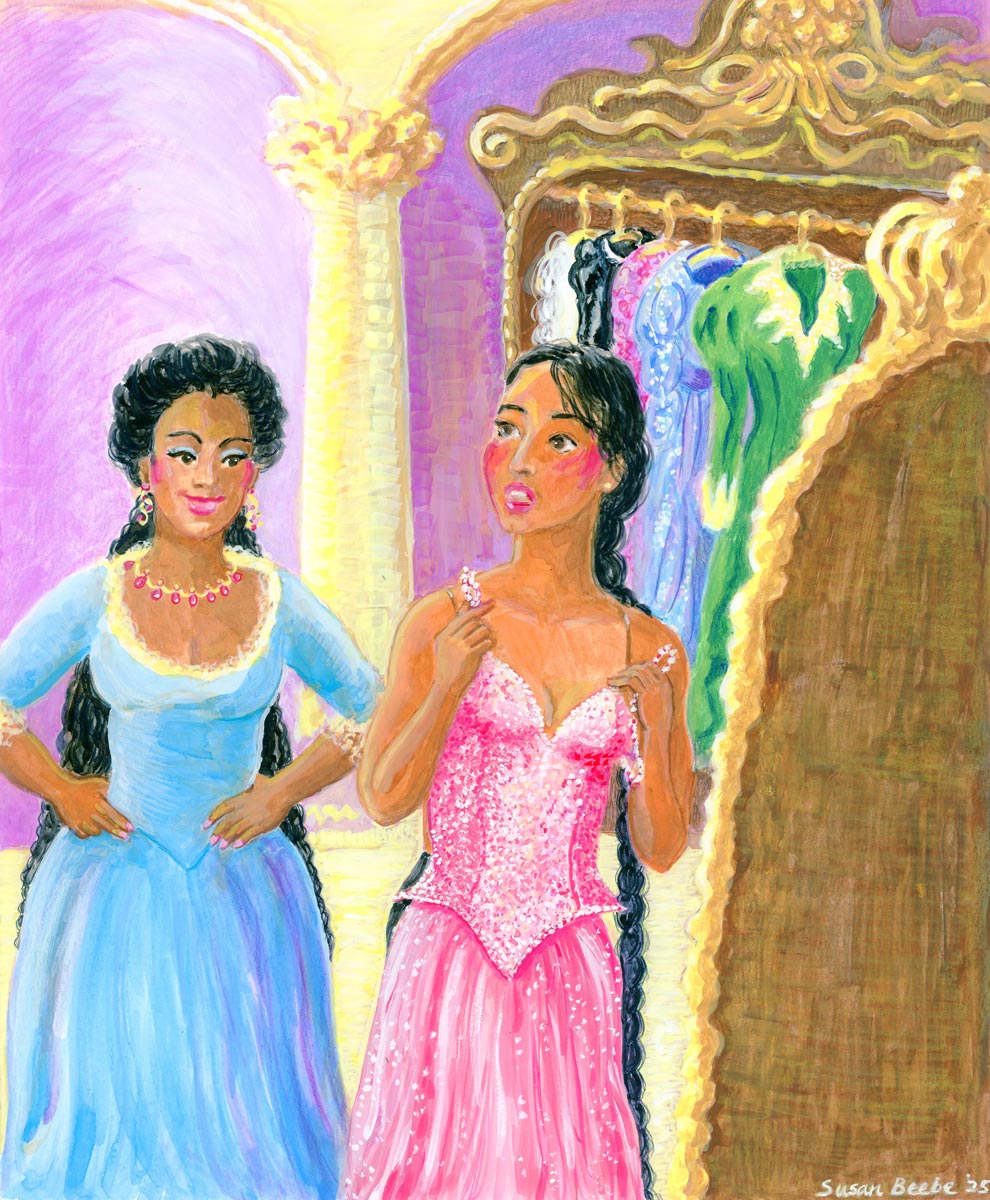 I first listened to Rogue Princess in Lucy Brownhill’s magical reading on CDs from the library. I started doing a few sketches, just for fun, but the project took hold of me, just as the story had. The otherworldly, fairytale setting freed me to create all kinds of costumes, scenery and technology. Before long, I was drawing every day and writing about the process.